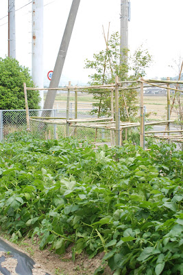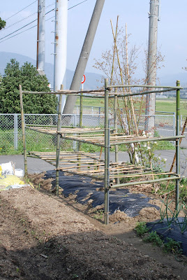 竹の棚作りが終わったあと、4月の終わりから、数日前にかけて数本の苗を第1弾の棚の下に植えた。