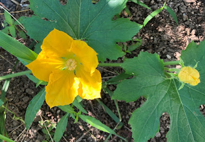 その畝の端の方にちょこっと見えていた自然発生のウリ科の苗は上の写真では分かりにくいが、非常に広い範囲に勢力を広げ、今ではあちこちで最初の写真のような黄色い花を付けている。