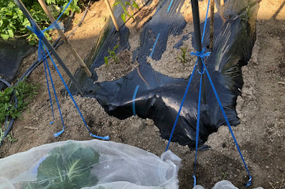 四隅には鉄パイプを固定用支柱として刺していたが、今日は芽の側に竹の支柱を立てた。