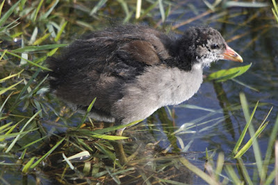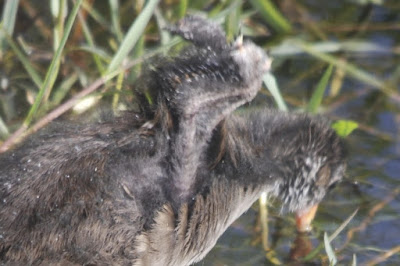 最初に孵化して赤ちゃんバンと呼ぶには大きくなってきたバンの子供達は、羽の色が黒色から薄茶色に変わってきた。