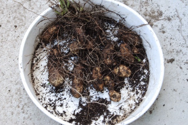 | 肥料はリッチだったのに、芋は小さい!こちらはほとんどが種芋サイズ。 まだこれは1本目の収穫なので、結論はもうしばらく収穫が終わったところで出そう。 |