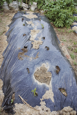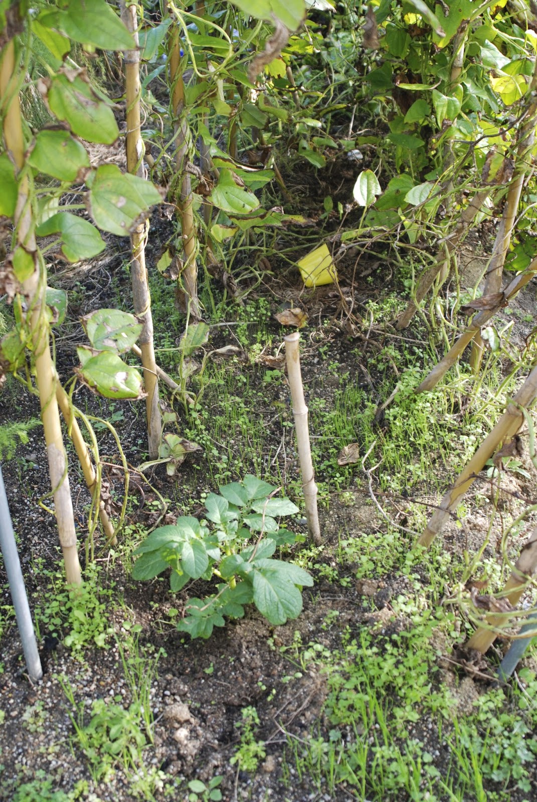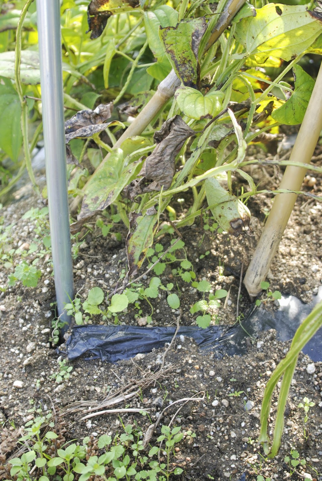 | 強風で倒れたのも、葉の茂りが多かったためだろう。 このマルチを掛けた区画では根元の茎も太い。 |