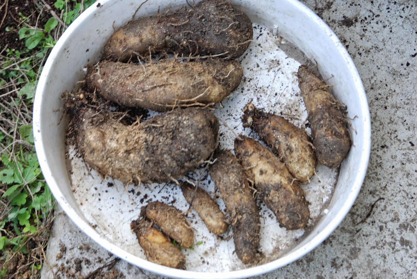 | 肥料はリッチだったのに、芋は小さい!こちらはほとんどが種芋サイズ。 まだこれは1本目の収穫なので、結論はもうしばらく収穫が終わったところで出そう。 |
