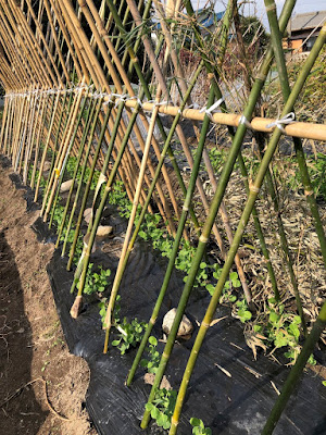 今年は竹を交差させて支柱を立てるやり方をやってみることにした。