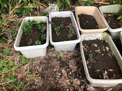 そして、第2菜園の木陰のプランターにも、第1菜園と同じようにたくさんの腐れる寸前の芋を入れていて、それらの種芋からかなり芽が出てきていた。