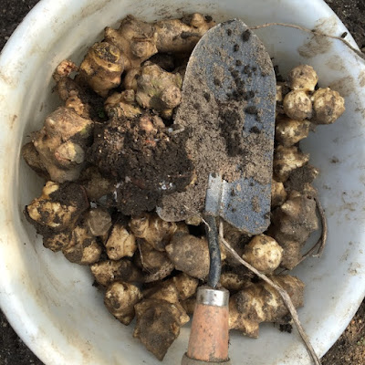 | 第2菜園では。ちょっと畝を起こしているとキクイモがたくさん採れる。 |