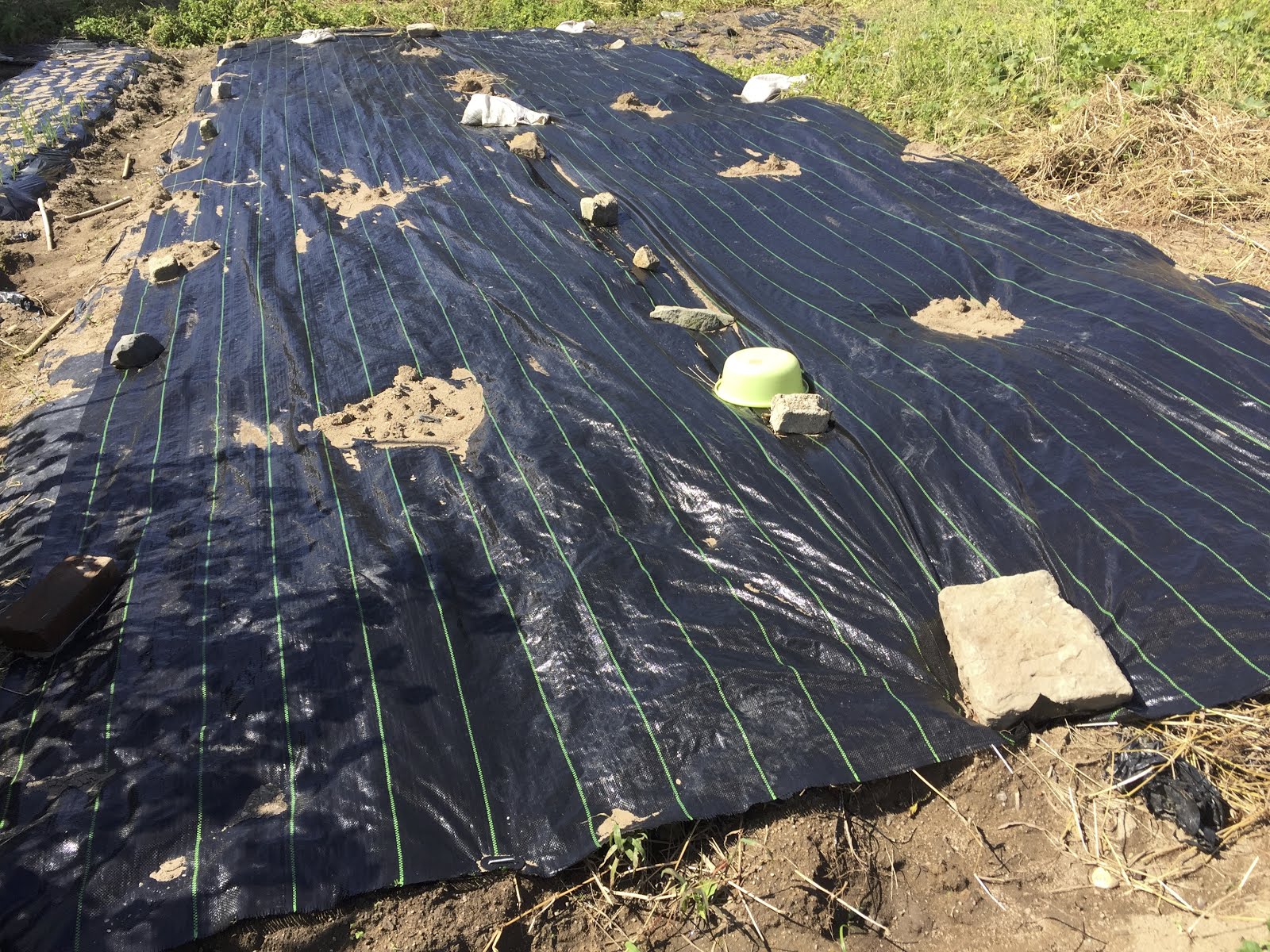 そこで、今すぐ使う予定のない場所は、春夏から、カボチャやズッキーニ、そして冬瓜のための広い敷地にするために、防草シートをかけて少し休んでもらっている。