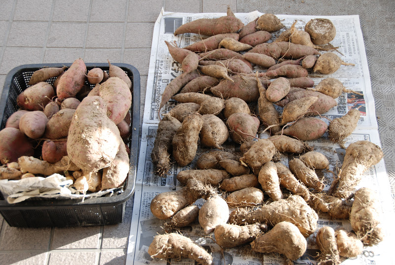 それにしても今日は昨日と変わって朝からいい天気。イモたちも保存前の日光浴だ。