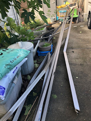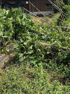 | 蔓植物は竹支柱ごと倒れているところが多かった。 ここは四角豆などの畝。 このほかツクネ芋、宇宙芋などもかなり傾いていた。 |