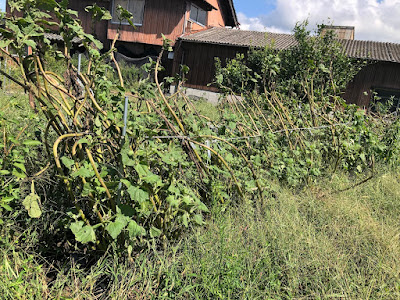 | 蔓植物は竹支柱ごと倒れているところが多かった。 ここは四角豆などの畝。 このほかツクネ芋、宇宙芋などもかなり傾いていた。 |