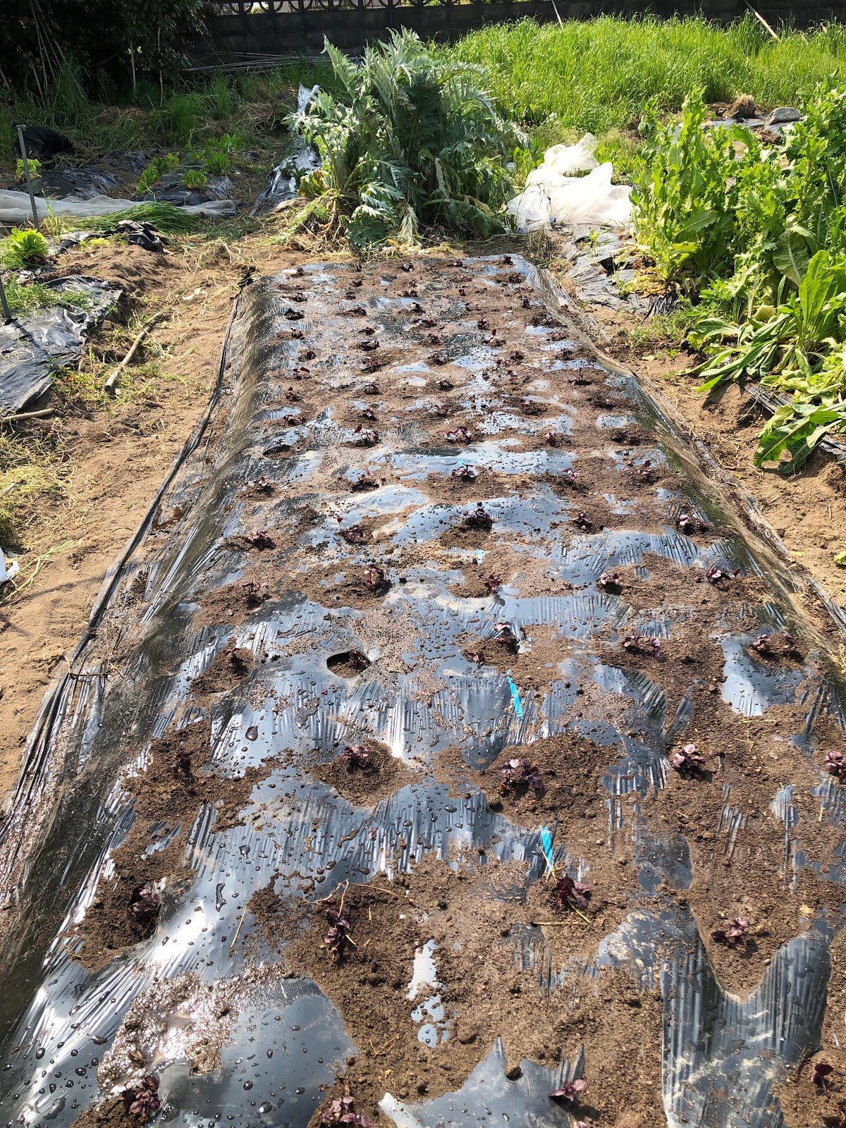 マルチを掛けて苗を植えていったが、植え穴には十分水を施しておいた。