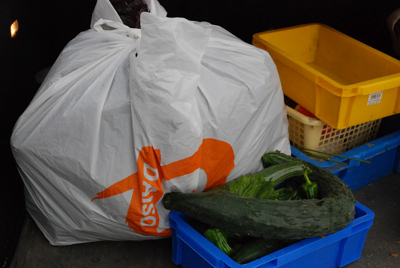 | 袋一杯に紫蘇もぎゅうぎゅう詰めに詰めている。 手前は今日の我が家の収穫野菜。取り忘れのキュウリが50cmくらいになっていた。 それでもまだ食べれそうな感じ。 |