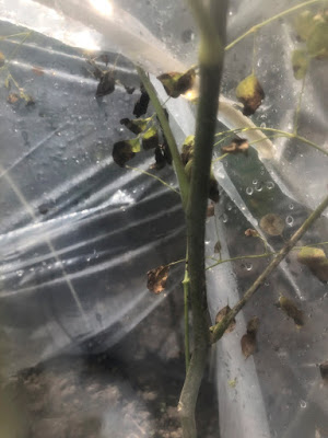 | こちらは第1菜園のビニールの中の苗木。 葉は枯れているが茎はまだ緑色なので期待が持てる? |