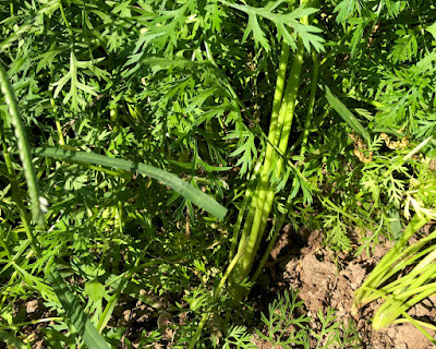 | 手前の方が収穫が終わった場所。 こんな小さな畝数カ所に時間差でニンジンが育っている。 |
