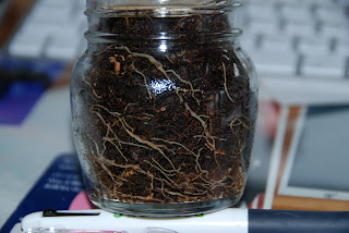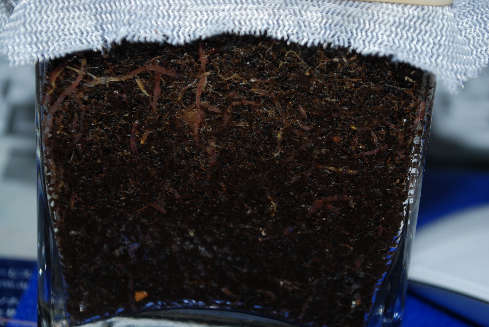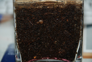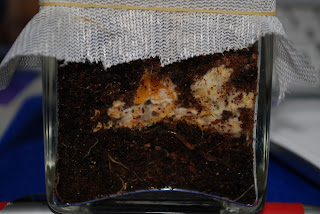 そしてこれが8日目の写真、若干ビンの壁にこびりついていたヒメミミズの数減った感じ。よくみるとシマミミズの赤ちゃんも数匹見受けられる。