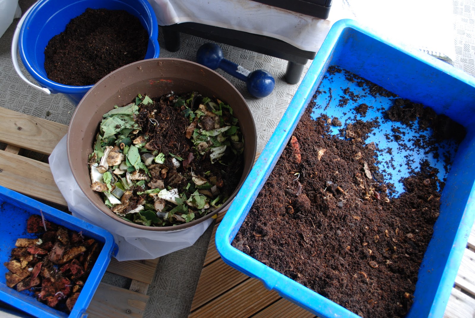 | 堆肥や食べ残し、みみず君などをまず右の広い箱に移し、みみず君と食べ残しの餌を真ん中のプラコン1号に新しい餌とともに再投入しているところ。今回は、前回与えた餌のうちサツマイモがまだ採りたてで硬かったためかまだ食べきれていなかった(左下)。少し小さく切って再投入。サツマイモは食べやすくなるとみみず君の大好物だ。 |