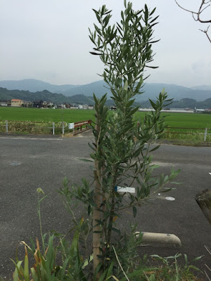 | 菜園の端に植えているオリーブの苗木。茎葉ともに健康そうに見える。 植えたときは1mくらいだった苗木が、もう1m50cmは超えている。 |