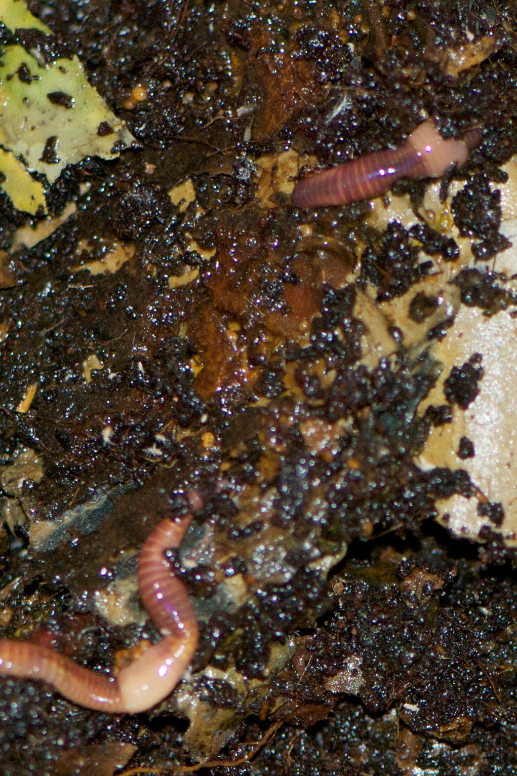 | 見慣れた人以外では分かりにくいだろうが、中央付近に2匹のミミズがいる。 どちらの環帯も膨らんでいる。妊娠しているのだ。 |