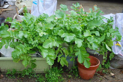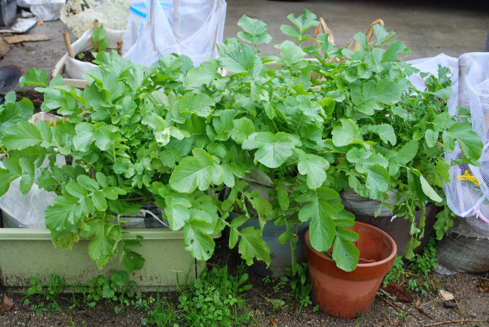 ということで、抜いた1本には差があったが、全体の育ちを見てみると土嚢袋で育てているダイコンに、腰水法を行うものとそうでないものでは差はないと考えていいだろう。