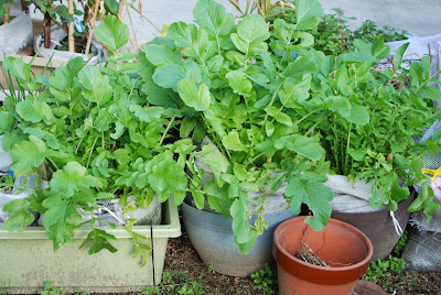 | どの土嚢袋も葉っぱが密集しすぎている。これらのダイコンは全て過密状態だ。 |