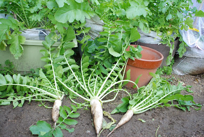 ダイコンの成育に一番影響したのは、腰水法を行う行わないの問題ではなくて、狭い土嚢袋に何本のダイコンを植えるかということだったようだ。
