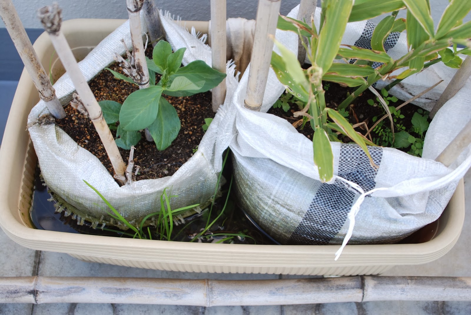 水が入ったプランター内に土嚢袋を置くことで、水耕栽培の要領で、水が土嚢袋にず〜っとしみ込んでいる状態を作ろうというものだ。