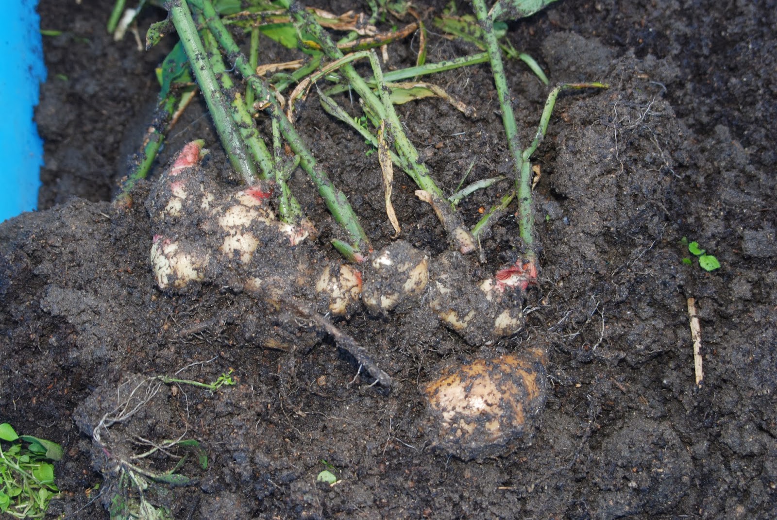 | 土は水をたっぷり含んでべちゃべちゃ状態。 それでもショウガは腐れていないようだった。 |
