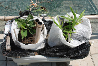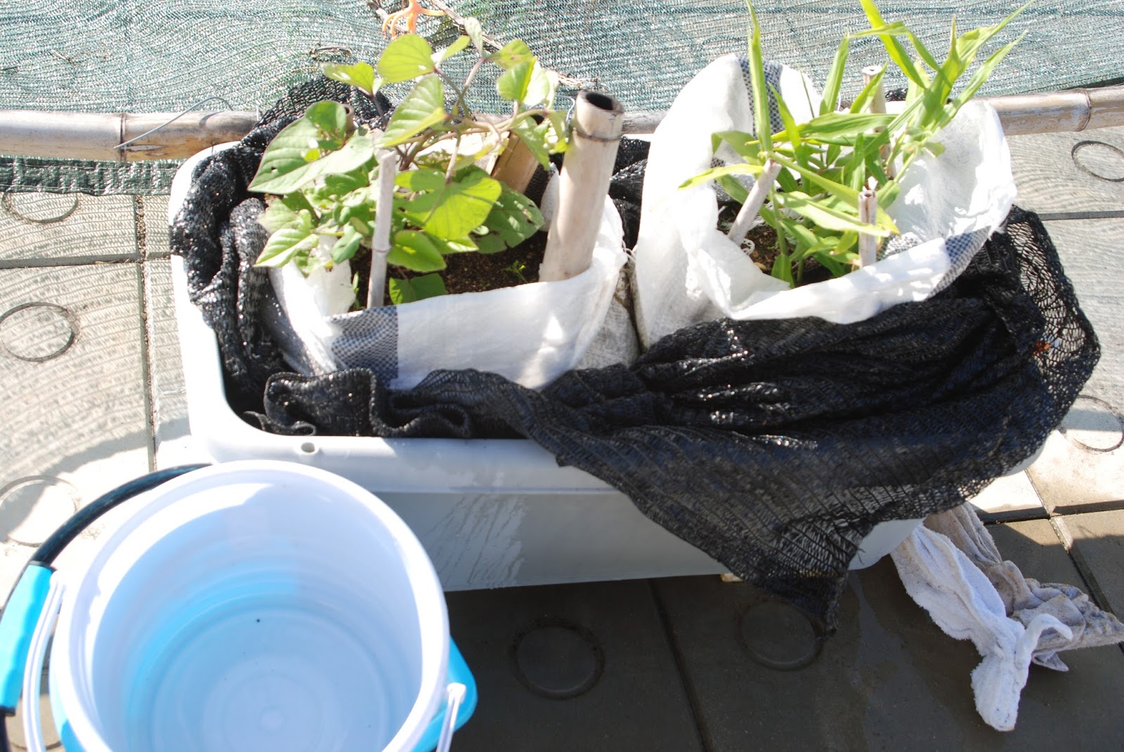 腰水法(storage water infiltration system)ではプランターに水を入れ、土嚢袋に浸みていく状態で、1週間水やりせずに苗や土の状態をチェックしようとしていた。