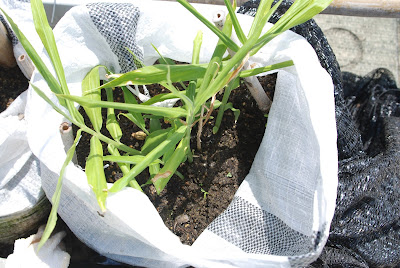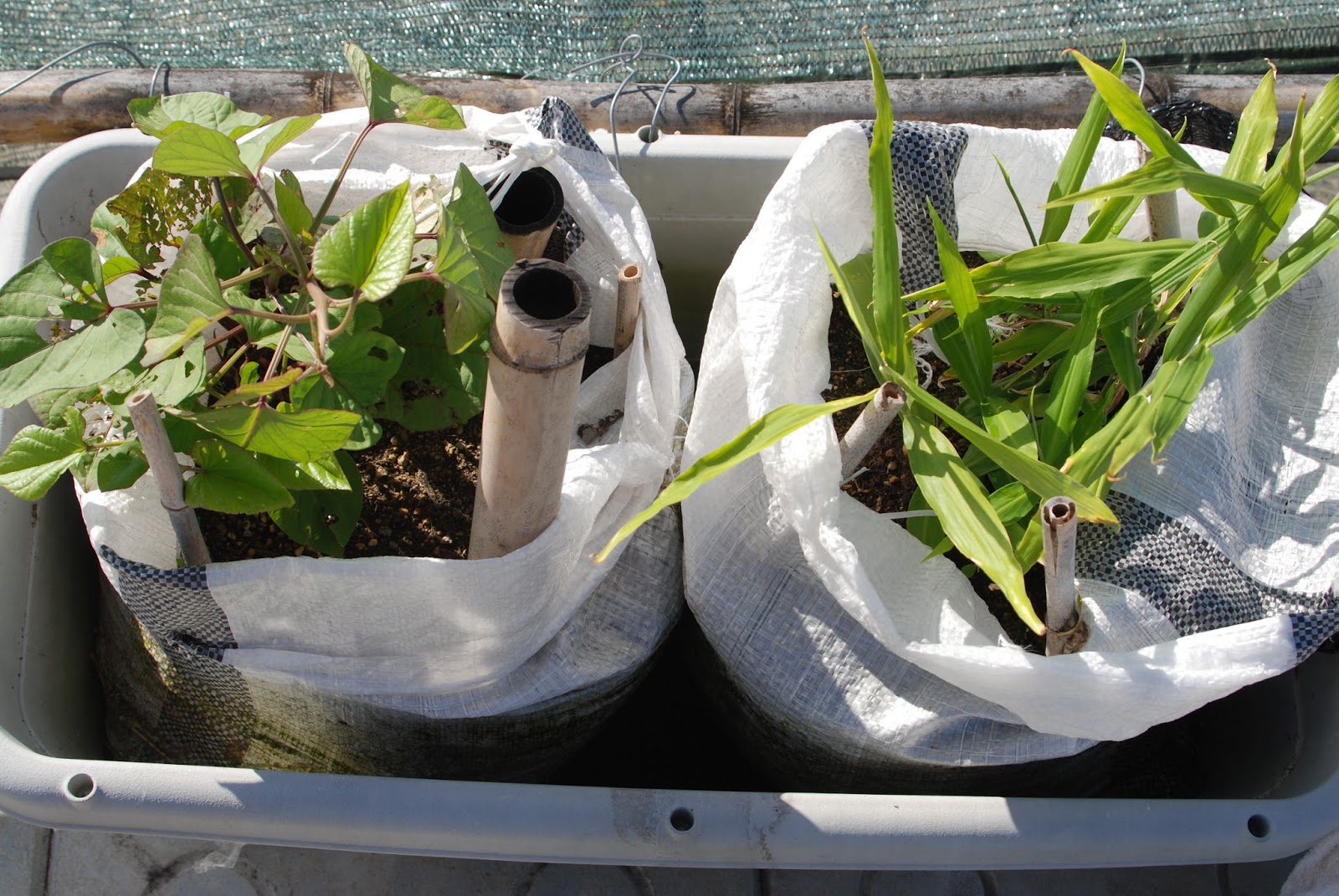 | 土嚢袋の周りにはたっぷり水が溜まっていた。 左は挿し穂したばかりのサツマイモ。右の土嚢袋には元々ショウガが植えてあった。 |