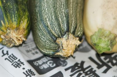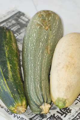| 今日取ってきたばかりの白ズッキーニの果柄はもちろん濡れている。 このまま乾いてくれれば嬉しいのだが。 黄緑ズッキーニの果柄は乾いているが、緑ズッキーニ(写真左)は怪しい。 |