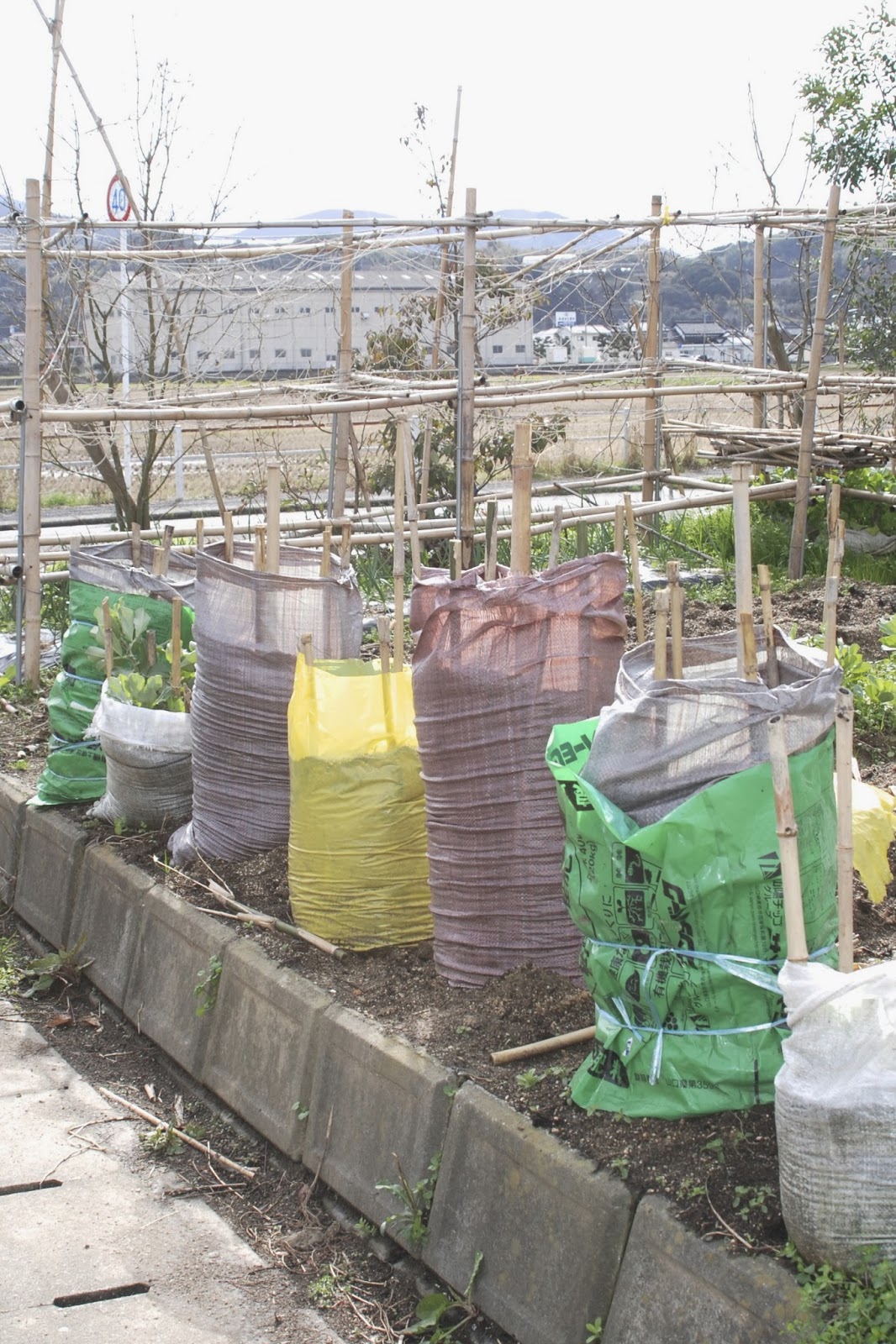 | 今年はガラ袋が4袋、肥料袋が1袋。今年の袋は底をくりぬいている。 だから、長いゴボウが出来ても心配ないはずだ。 まだ、ガラ袋の周りのビニールによる補強が終わっていないものもある。 |