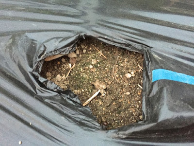 | これは10日程前の写真。マルチに穴を開け、そこに種を数個づつ蒔いていた。 ところが出てきている芽の数が異常に少ないのだ。 どうやら出て来た芽が何者かに食べられているのだ。 |