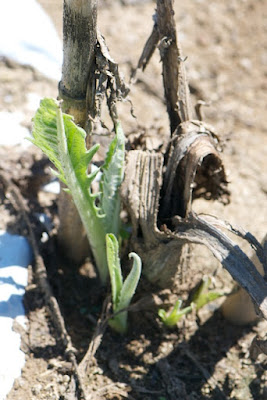 枯れたアーティチョークの苗元から、しっかり復活の芽吹きを認めているものもある。