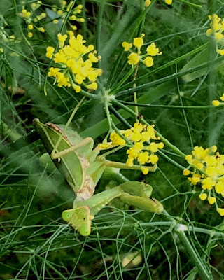 | こちらはフェンネルの花の側で休んでいたカマキリ。 |