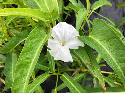 ところで、オクラの苗の足元には空芯菜を植えているところもあるが、こちらは今の時期花が咲いている。