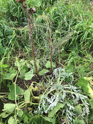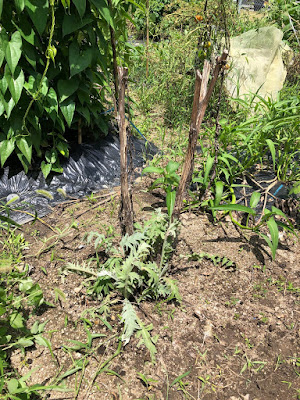 3週間前、第2菜園で雑草除けシートに穴を開けアーティチョークをメインの育て場所と思っていたエリアは雑草だらけ。