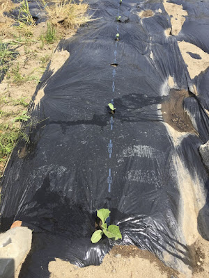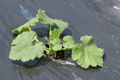 長いズッキーニは、先日ポットに種まきしていたものにも芽が出てきたので、蔓野菜の畝にも一部植えてみた。