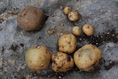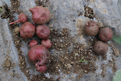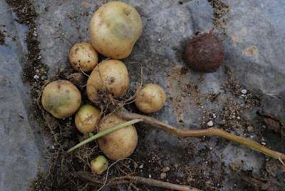 こちらは芽出し実験を行ったアンデス赤(3本分)。種芋も小さかったが,大きな芋は出来ておらず収穫も更に少ない。種芋3個でこの量と大きさだ