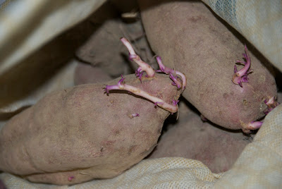 土嚢袋に入れて、このサツマイモが種芋になり得るか?