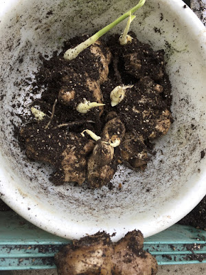 待ちきれなくなり、その容器の一つから種ショウガを取り出して小さな白い芽を見て安心して、それらをそのまま畝に植えた。