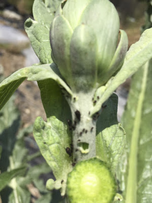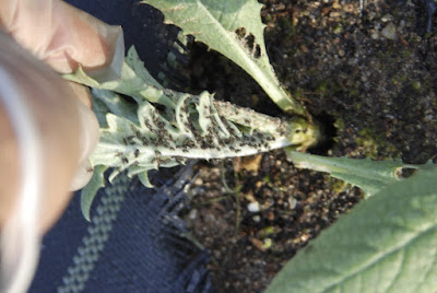 アーティチョークの大きな苗では、少々のアブラムシで苗が弱ることはないのだが、春に種を蒔いて育てている小さな苗にも早くもアブラムシが来ている。