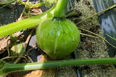 ズッキーニやナスやトマトに少し遅れをとっているカボチャも、1週間ほど前に2cmほどの小さな実がなっているのに気づいたが、その実が日々大きくなっている。
