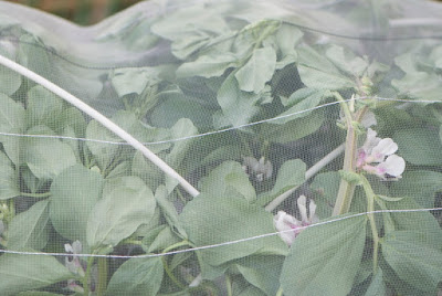 確かに空豆の花や枝先は、防虫ネットに押さえつけられている。