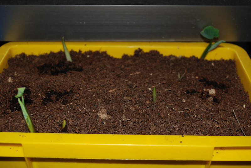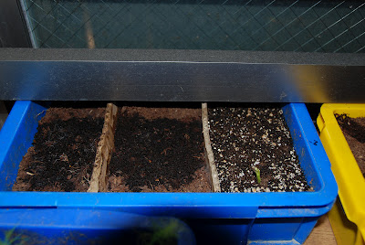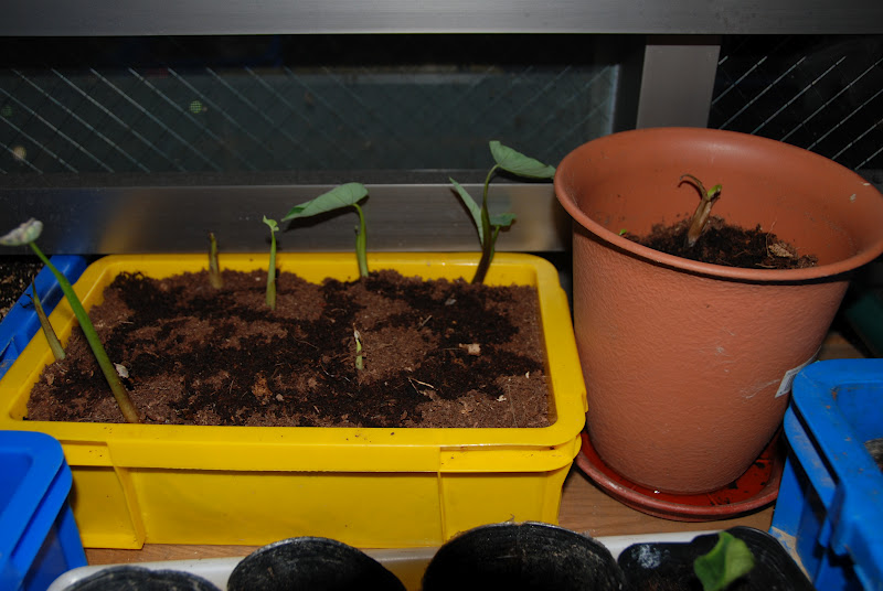 以前設定していたツクネ芋の芽出し実験で、種まき用の土(写真下右)に芽が出てきた!これにはビックリ。