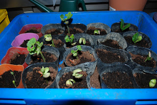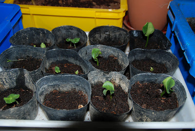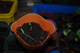 | 左が逆方向に植えたもの、すくすくと芽が伸びてきた 右の鉢に入っている方が順方向に植えたもの。芽が出てくるのは早かったが育ってこない。 順方向に植えたのが悪いのか?鉢植え条件が悪いのか? |