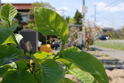 苗の植え付け(キューリ、モロッコ) 野菜作り X Facebook Pocket LINE 2012.05.06 今日は苗の植え付けをしたが,天気予報がはずれ非常に暑かった。 あまりの暑さに苗がやられないか、いや、私の顔が黒こげにならないかも心配なところ。 予定を変更して、キューリとモロッコのみを植えることにした。 まず,苗を植えるところに十分穴を掘って水をたっぷり与え、その穴にミミズ堆肥を十分入れ,土と混ぜ合わせ、その上に苗を植えた。 手前がモロッコ、向こうがキューリ。キュウリは苗を買って植えた。 うれしかったのは、弱っていた畑側に植えた4本の植木が皆元気になってきたこと。 どの木も新しい芽が伸びてきている。 こちらはイロハモミジ そしてこちらは新芽が出てきたモクレン オババが木の根元に乾燥予防に、刈り取った草を敷いてくれていたのも効果があったみたいだ。 枯れるのではとかなり心配したがもう大丈夫だ。 こんな暑い日は天日乾燥していたワイルドストロベリーやキクイモの葉もカラカラだ。 手で揉むだけで粉々になり出来上がりだ。 我が家の金太も久しぶりの散髪だ。いつものように解放された後はのたうち回っている。