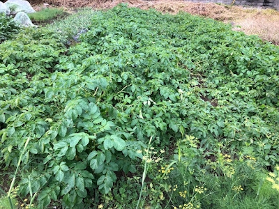 | 第1菜園の土嚢袋からは先日2kg以上の芋が採れた。 記録更新する芋が出てくると嬉しい。 |