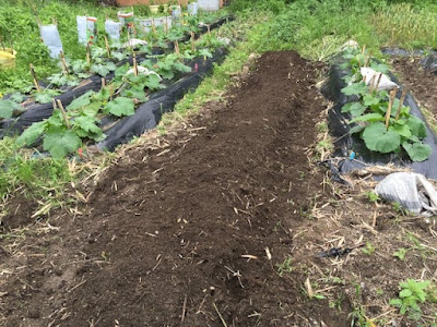 | この畝の両隣には元気いっぱいのズッキーニの畝がある。 うまく育てば、去年の倍以上の収穫量になりそうだ。 |