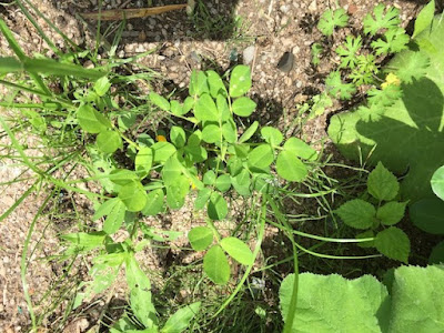 こちらの苗は、周りの雑草やカボチャの苗に責め立てられて、今後の育ちが危うくなっている。