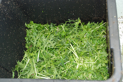 写真には撮っていないが受け皿の方には大量の量の液が溜まっていた。色は茶色でミミズのおしっこのようだが上蓋の小さな穴から入った雨水が底の通水孔から出てきたのか、ミミズ小屋の横に当たった雨が下に溜まってミミズのおしっこと混じったのかはよくわからない。どちらにせよプールの水は多量であふれてこぼれていた可能性もある。液の中には数匹のミミズが浮かんで居たが皆生きていた。上の写真は液を野菜に与えたあとの受け皿。数匹のみみず君が残っている
